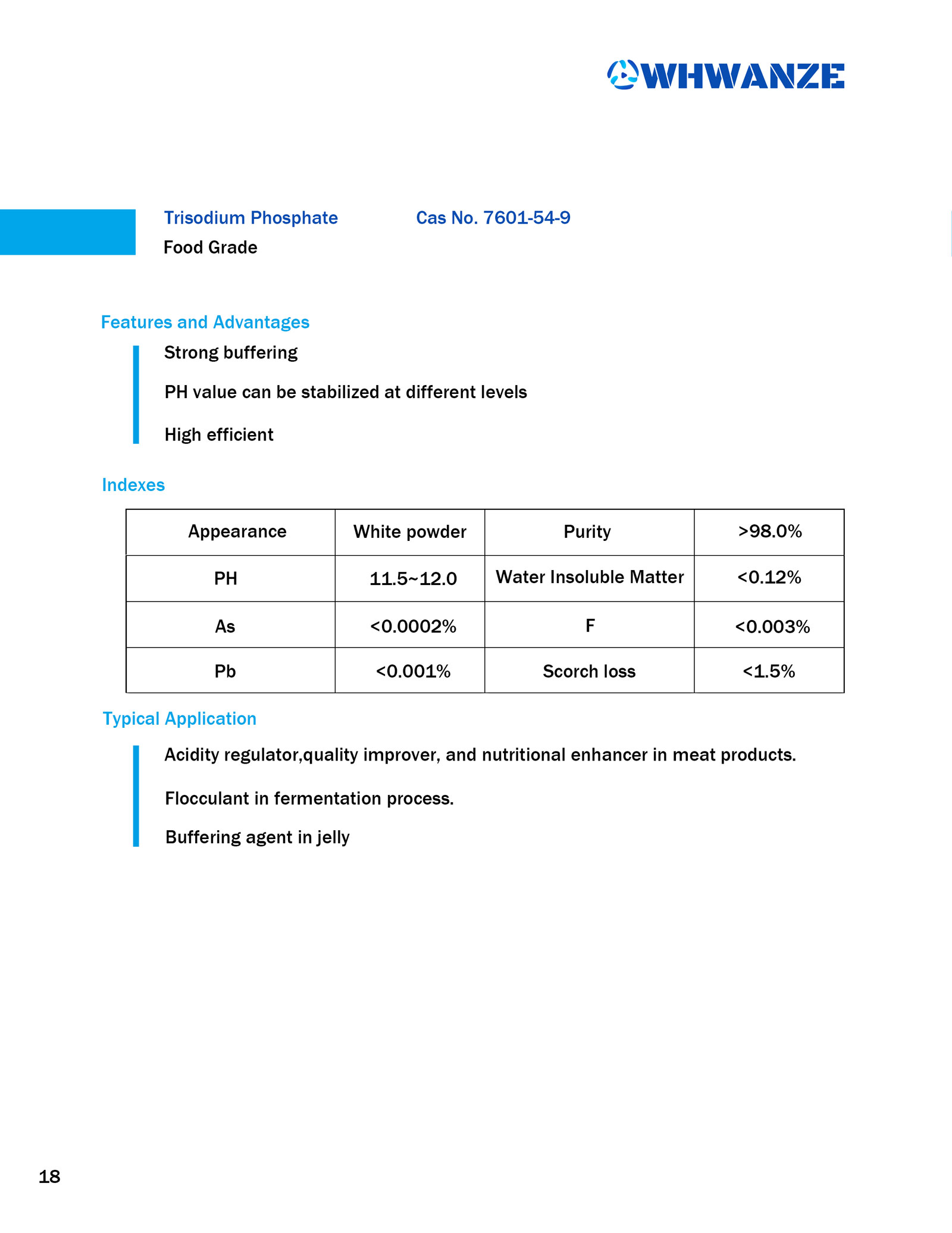 - Used as acidity regulator in meat products and minced fish in food processing, as food quality improver, nutritional enhancer, etc.